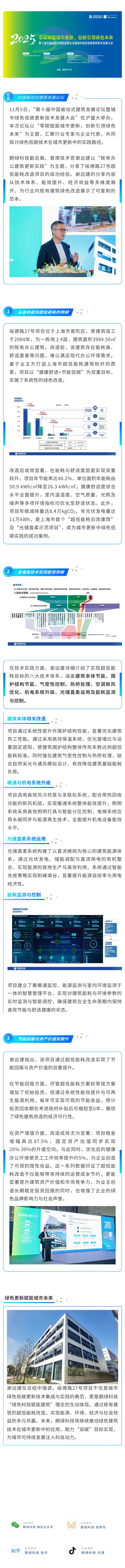11月5日,“第十屆中國被動式建筑發展論壇暨城市綠色低碳更新技術發展大會”在滬盛大舉辦。朗綠科技副總裁、首席技術官謝遠建分享綏德路27號超低能耗改造項目的成功經驗。