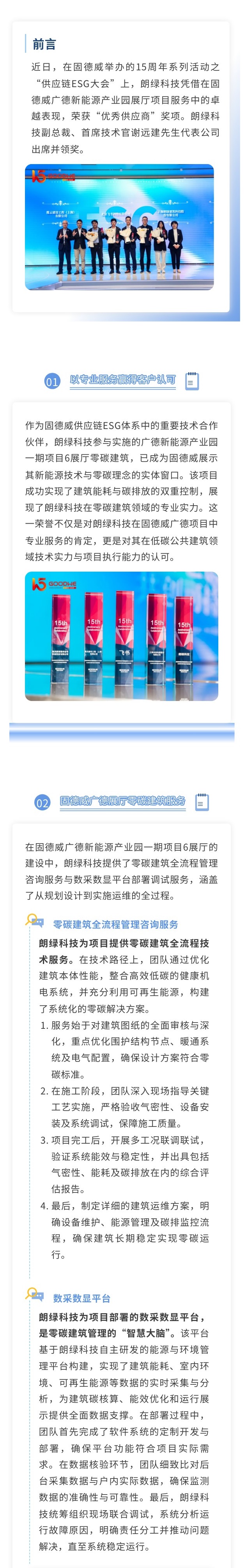 11月7日,在固德威舉辦的15周年系列活動之“供應(yīng)鏈ESG大會”上,朗綠科技憑借在固德威廣德新能源產(chǎn)業(yè)園展廳項目服務(wù)中的卓越表現(xiàn),榮獲“優(yōu)秀供應(yīng)商”獎項。朗綠科技副總裁、首席技術(shù)官謝遠(yuǎn)建先生代表公司出席并領(lǐng)獎。